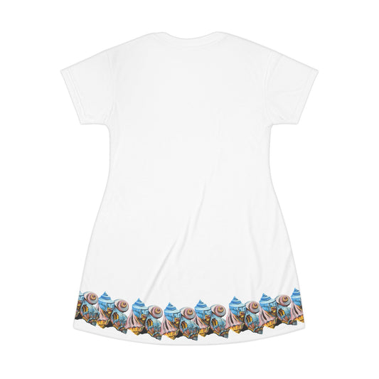 T-Shirt Dress (AOP), Artsy Beach Shells, Beachwalker Club Collection