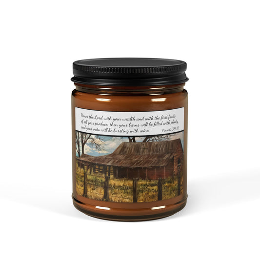 Scented Soy Candle (Multi-Size, Amber Jar), Proverbs 3:9-10, Barn, FrediFreds Home Collection